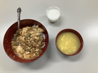 メニューは、麻婆丼と中華風コーンクリームスープと杏仁豆腐です。