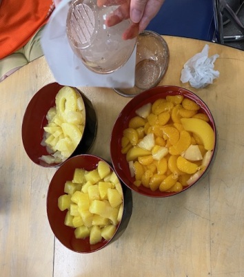 フルーツは係のOさんが中心となって切り、Mさんも率先してお手伝いしました。