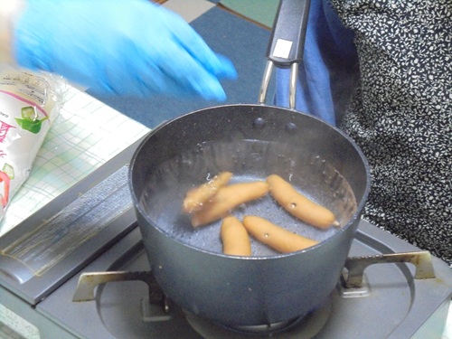 ●鍋にお湯を沸かし、沸騰したら卵を静かに入れて冷やす(固ゆで11分)