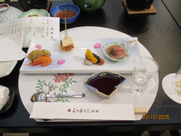 料理も豪華で、旬菜5点盛から始まり、旬魚の御造りやアジのさんが焼、豚角煮茶碗蒸し、鰹土佐造り、インド風天ぷら、和牛陶板焼き、海老の釜めし、アサリのみそ汁、三日月ゼリーなど盛りだくさんでした。